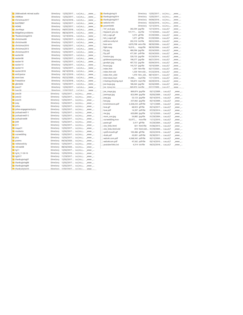 Below this paragraph is a link to the jpeg picture (called ftp.jpg) showing the current contents of our web site. Each sub-directory (shown as folders) contains pictures posted from a particular event. For example, to see pictures posted from Easter 2010, type "walcek.com/easter10" in the URL area of your browser.